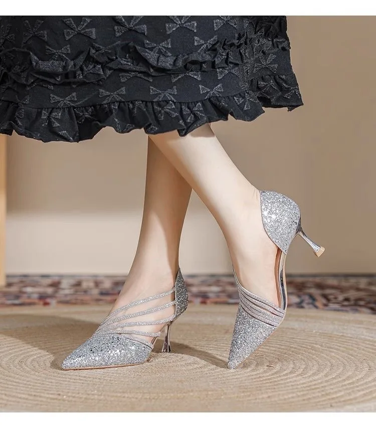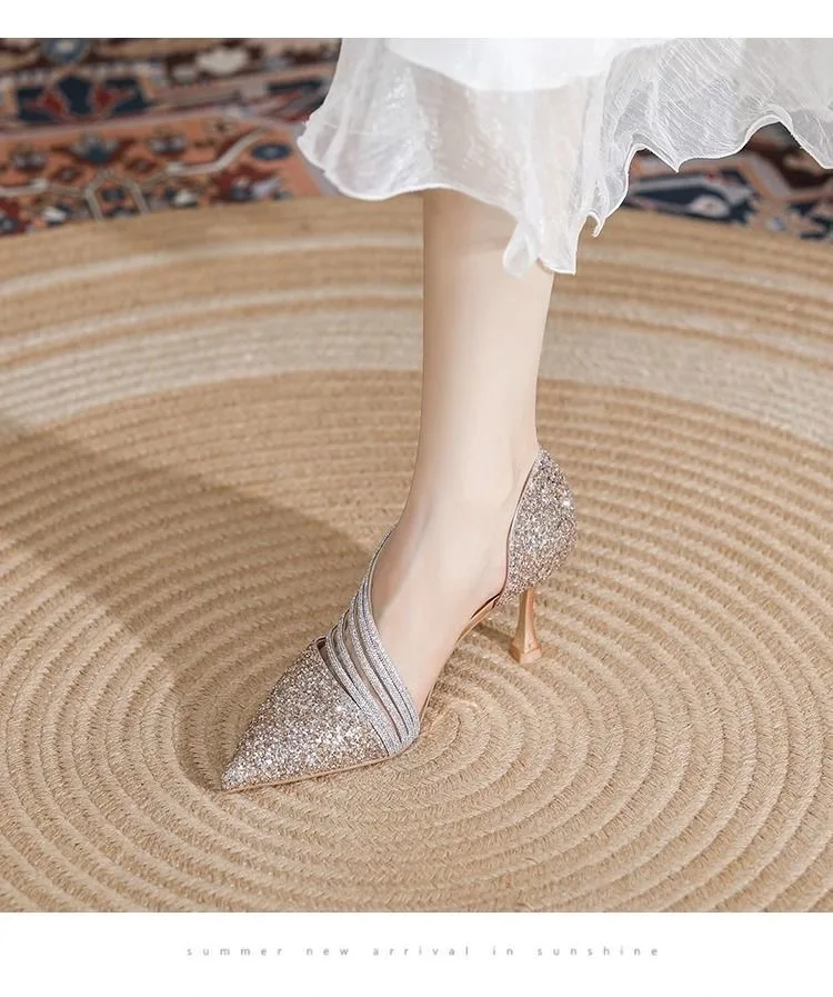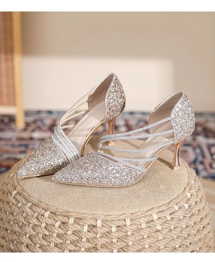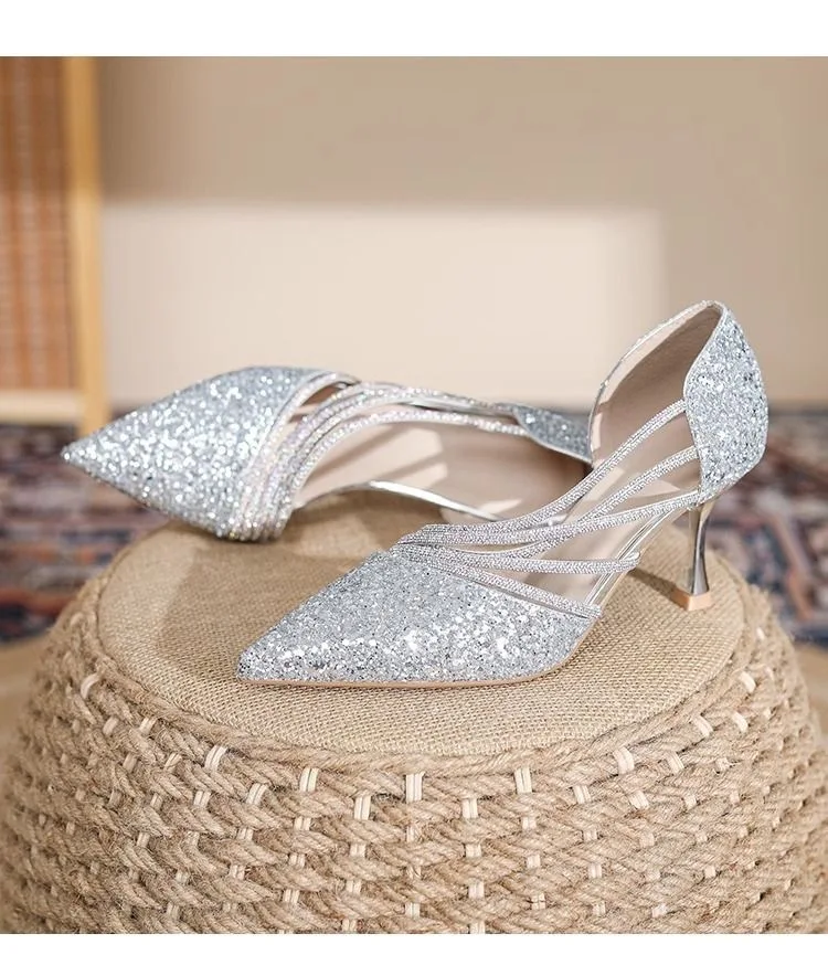 High-Profile Chemical Substances: None Fashion Element: Sequins Style: Fashion Occasion: Wedding Toe Shape: Pointed Toe Material: Sequined Fabric Heel Type: Stiletto Heel Color:Silver,Gold Size: 36-39..