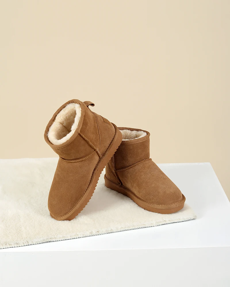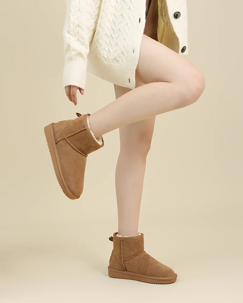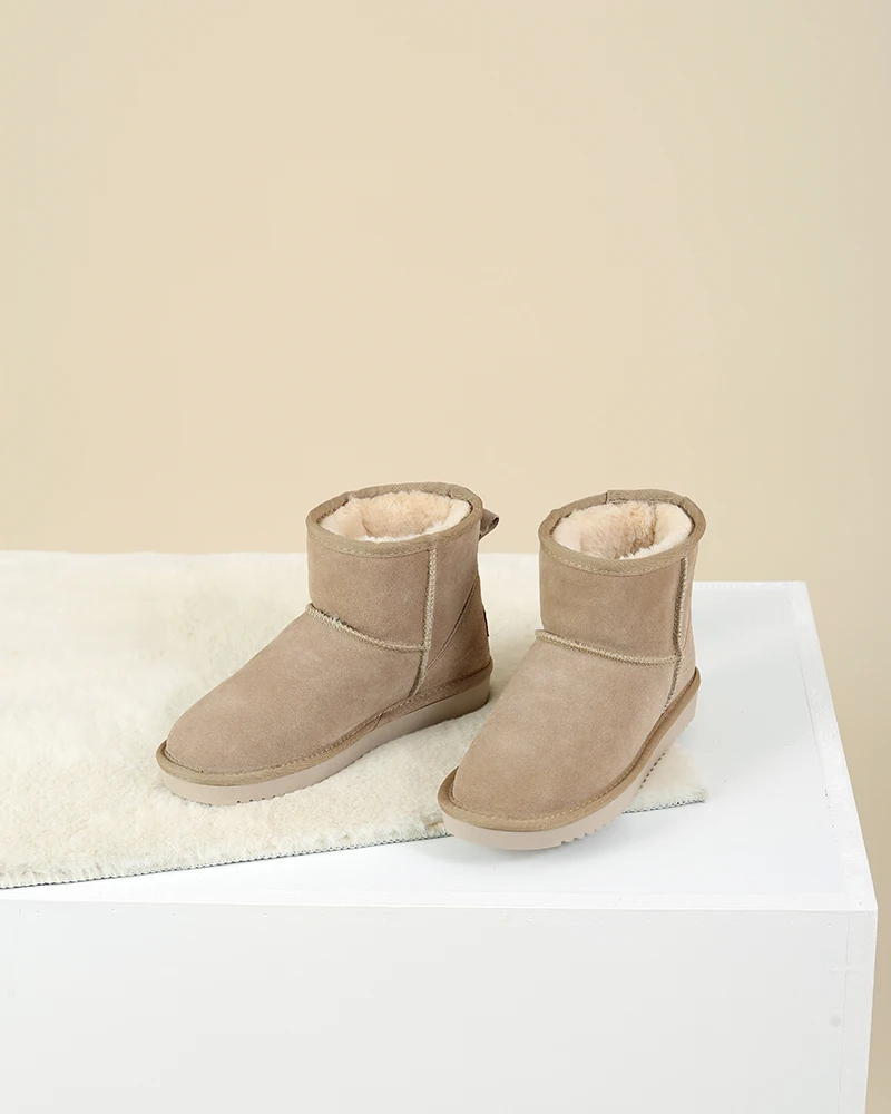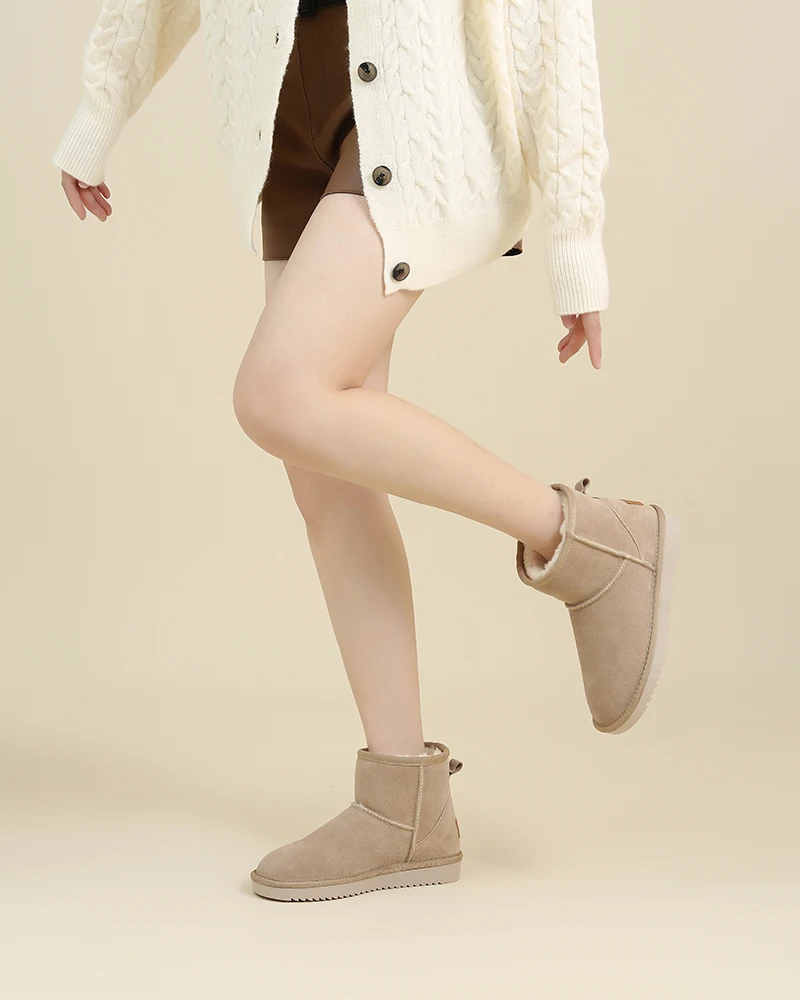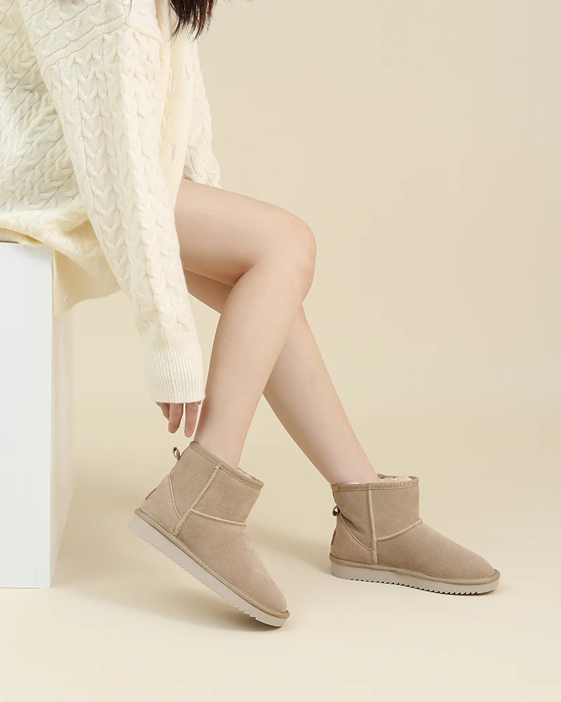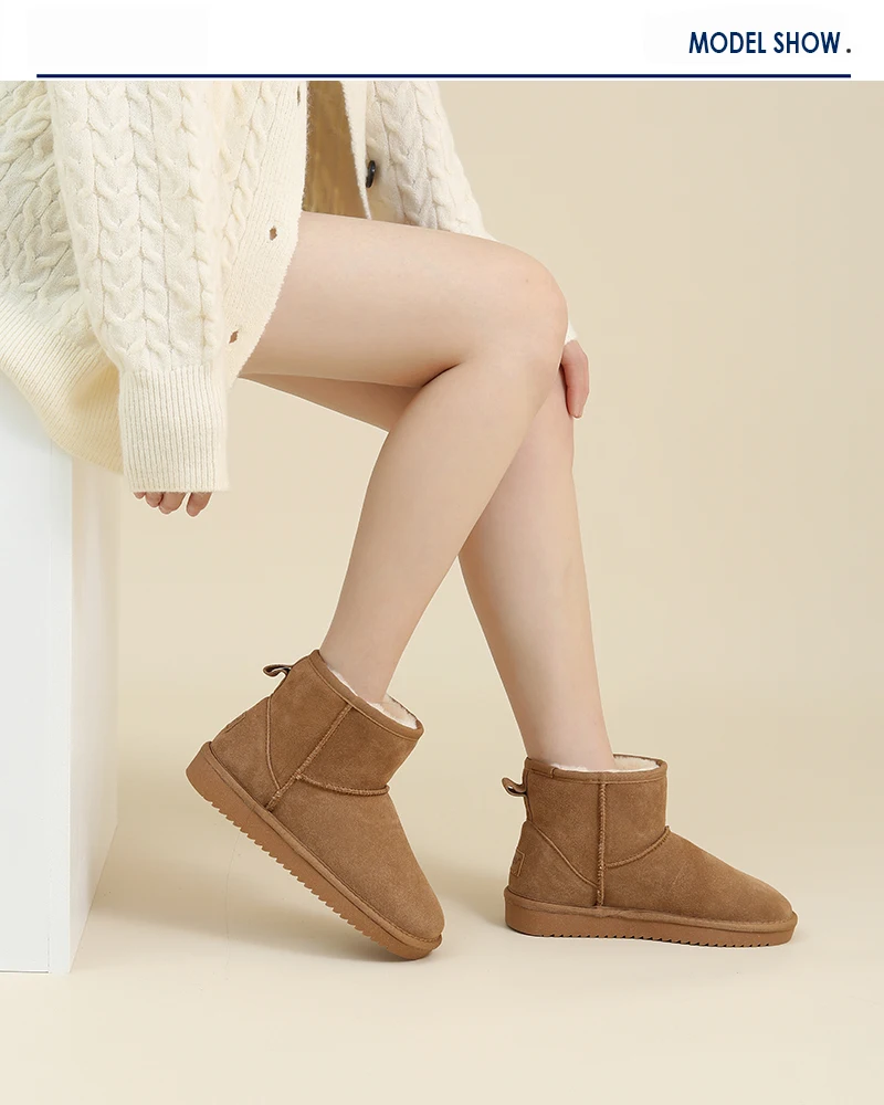 Upper fixing method: Stitching Gender: Women Style: Leisure Fashion Element: Sewing Material: Cow Suede,Rubber,Wool Blend,Natural Fur Color: Beige,Dark-brown Size: 35-40 Pattern Type: Solid Season: Winter Heel Type: Flat Toe Shape: Round Toe Boot Type: Snow Boots Boot Height: Ankle Item Type: Boots ..